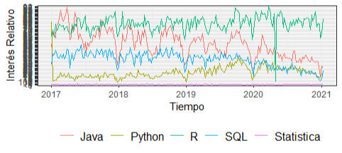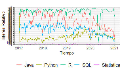 # usando librería gtrendsR keywords=c("Java","R","Python","SQL","Statistica")